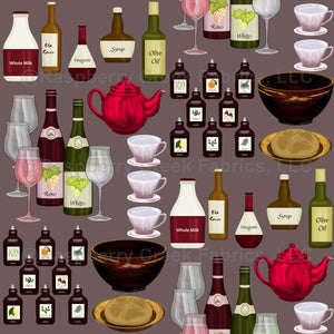 Old glass bottles, red enamel teapots, delicate teacups, kitchen bowls and goblets create an interesting vintage nostalgia design on antique plum.