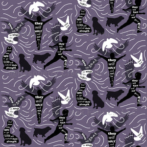 This design on boysenberry features boys praying, walking and running with dogs, doves, and eagles, and the words from Isaiah 40:31.