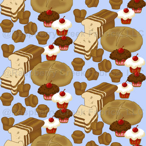 This yummy fabric design for use in the kitchen and dining room features loaves of bread, rolls, and cupcakes on a blue wash background.