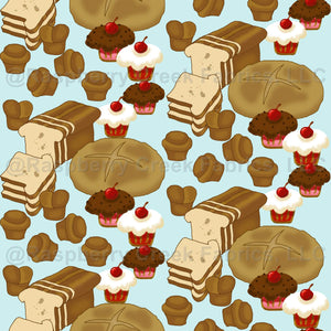 This yummy fabric design for use in the kitchen and dining room features loaves of bread, rolls, and cupcakes on pale iceberg blue.