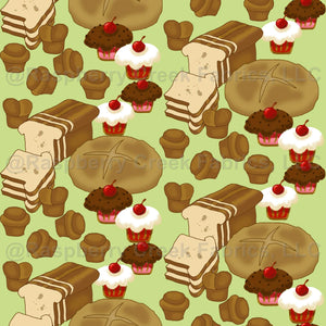 This yummy fabric design for use in the kitchen and dining room features loaves of bread, rolls, and cupcakes on medium spring green.
