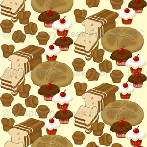 This yummy fabric design for use in the kitchen and dining room features loaves of bread, rolls, and cupcakes on pale yellow.