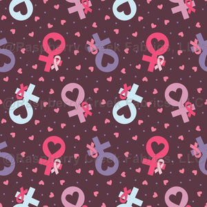 A pattern design featuring female gender symbols with pink ribbons to spread awareness, inspire hope, and express support towards the continuous fight against breast cancer.