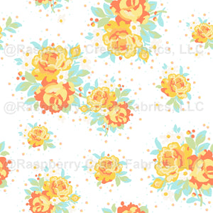 A sweet scattering of citrus roseswith aqua leaves, on fresh white. Accented by random polka dots.