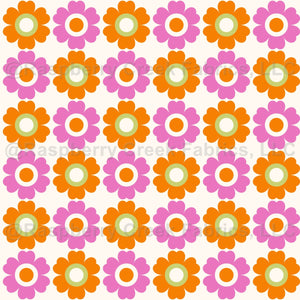 1970s retro inspired simple floral of geometric flowers in a citrus inspired colours of bright pink, purple, orange and green