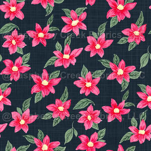 Bright Pink Flowers Linen Texture Whimsical Floral Deep Dark Blue