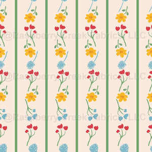 Bright Summer Garden Striped Floral; Bright Green Stripes with small red, blue, and yellow flowers in a vertical pattern on a cream background; romantic, feminine floral pattern