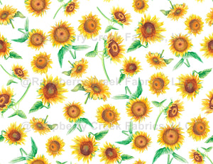 Bright sunflowers burst in a playful toss pattern—cheerful, lively, and full of sunshine—perfect for adding joy to any project!