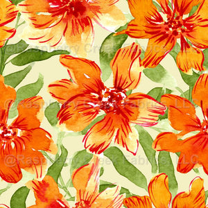 Watercolor tropical flowers in bright orange and red with lots of leaf branches in a tropical jungle layout.