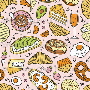 Outlined doodle fabric pattern with delicious sweet and salty food for a perfect sunday brunch.