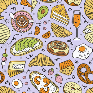 Outlined doodle fabric pattern with delicious sweet and salty food for a perfect sunday brunch.