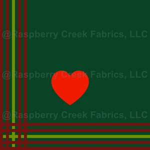 Burgundy and green plaid, with red hearts, against a dark green background.