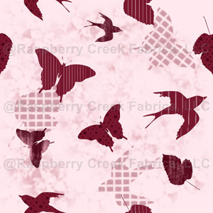 Butterflies and swallows in distressed and textured shades of cranberry on pink flit about on a subtly marbled background. The variations in the design are intentional.