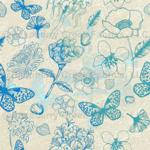 Hand-drawn butterflies and flowers in shades of blue on a slightly textured background.
