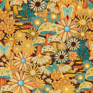 Step into a retro wonderland with this bold and whimsical pattern featuring golden daisies, spotted mushrooms, and fluttering butterflies. The rich autumn-inspired palette of ochre, teal, burnt orange, and chocolate brown evokes a vintage 70s vibe, perfect for statement sewing projects.