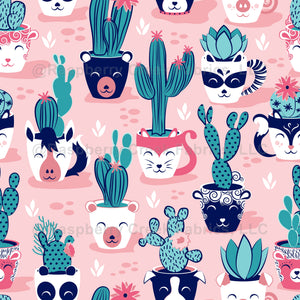 Cacti and succulents cuddly pots // pink background navy white and rose animal vessels green teal cactus
