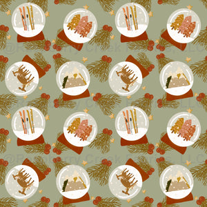 Whimsical woodland snow globes with berries and stars in background on light Sage green.