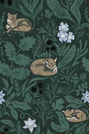 Foxes sleeping in a deep green woodland with sky blue flowers