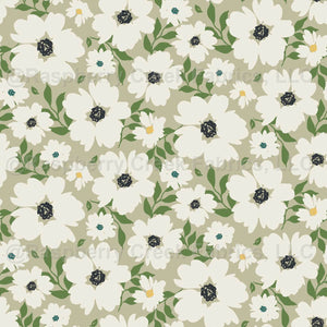 Minimalist soft white florals and lush green leaves on a calming serene background perfect for nursery themes, spring trends, and elegant products