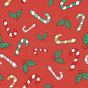 Candy Canes and Christmas Holly on Retro Red