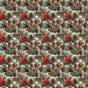 Cardinal Bird Couple In Forest Pines In Green, Red, Brown, Tan And Black For Christmas Holidays