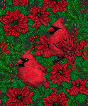 Hand-drawn Christmas pattern with cardinal birds, poinsettia flowers, winter berries, and fir branches