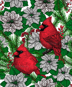 Hand-drawn Christmas pattern with cardinal birds, poinsettia flowers, winter berries, and fir branches