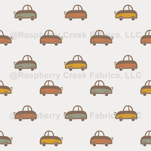 Modern hand-drawn car doodle pattern. Minimalist aesthetic with a playful, trendy nursery vibe. Featuring simple, cute vehicle illustrations in a clean, repetitive row layout. Perfect for whimsical kids' apparel, baby textiles, and unisex decor.
