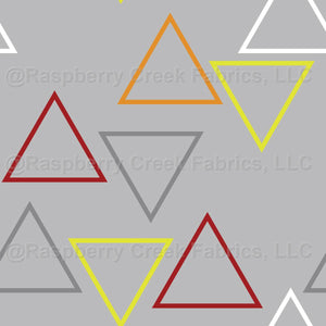 An abstract and geometric print featuring simple triangles in a bold winter palette of white, grays, red, orange, and neon yellow.
