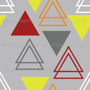 An abstract and geometric print featuring cascading triangles in a bold winter palette of white, grays, red, orange, and neon yellow.