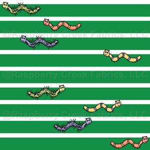 Cute, colorful striped and spiny caterpillars with happy faces race between horizontal white stripes on lime green fabric.