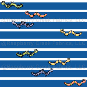 Cute, colorful striped and spiny caterpillars with happy faces race between horizontal white stripes on this navy blue fabric.