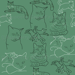 Contemporary line art sketches of cats in black and white create an interesting collage on garden leaf green.