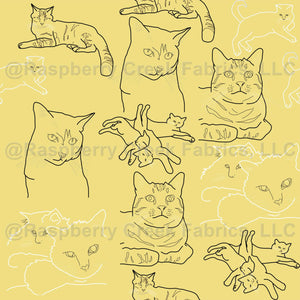 Contemporary line art sketches of cats in black and white create an interesting collage on sunshine yellow