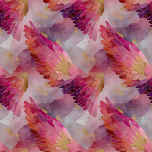 Celestial Angel Wings In Pink, Purple And Orange Hues On A Watercolor Wash and Gold Ink Embellishments