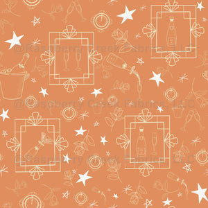 Champagne bottles and clinking glasses feature in art deco inspired frames for a celebratory mood, with clocks striking 12 among a field of stars and roses against a creamy orange background.