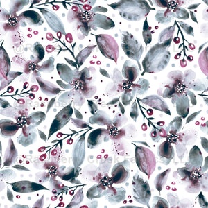 Watercolor blooms & botanicals in muted magenta pink and gray on white. Berries, leaves,Soft, pastel, cool, cottage core. Lg Scale, fabric, home decor