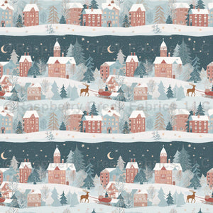 Charming Christmas Snowy Mountain Village with brick buildings under a starry night sky with stars and crescent moon, reindeer and sled