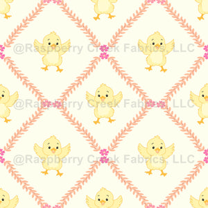 Sweet little chicks nestled within a soft, leafy diagonal lattice in bright pastels. Ideal for baby clothing, nursery, farmhouse walls and cabin decor.