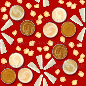 Hard cheese wedges, soft nuggets, and swirly cheese dips create a fun snack-themed design on a bright festive red.
