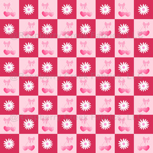 A bold blush and hot pink checkers featuring alternating cherries and daisies, perfect for Valentine’s themed quilting, crafts and apparel.
