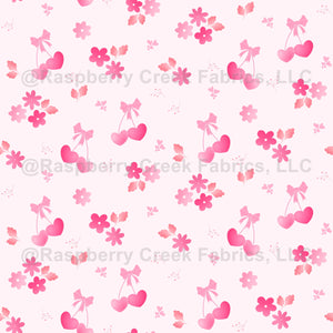 Playful heart shaped cherries with bows and flowers scattered on a pink background, offering a cheerful and fresh Valentine aesthetic.