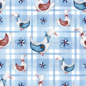 Watercolor Hand Drawn Illustration of Chic Country Geese and Blue Flowers. Soft Blue Stripes. Rustic Plaid, Check, Gingham