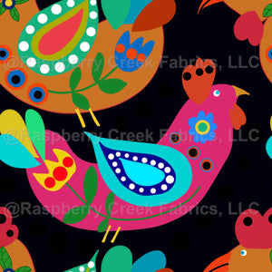 Chicken Folk, Fiesta Cluckers, Colorful Birds Pattern, Black Background