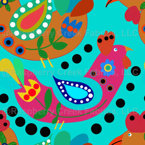 Chicken Folk, Fiesta Cluckers, Colorful Birds Pattern, Turquoise Aqua Background