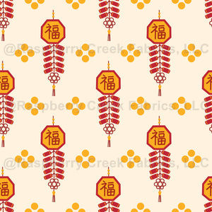 A pattern design featuring Chinese New Year firecracker charms with the Chinese character "Fu" meaning "Good Luck" or "Fortune."