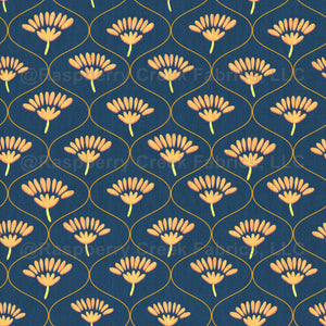 An ornate yet simple floral pattern in an ogee repeat. With fan like yellow floral blooms.