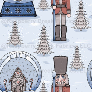 A whimsical hand drawn seamless pattern design with adorable nutcrackers and pretty snow globes, topped up with a scene of snowy Christmas trees. Available in a smaller design size