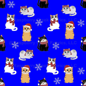 Christmas Collection: Adorable multicolored cats wearing scarves, red and white Santa hats and winter caps while snowflakes fall on a electric blue background.