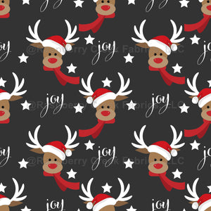 Christmas Collection: Deer with white racks, a red and white scarf with Santa hat is surrounded with "joy" words on a black background.